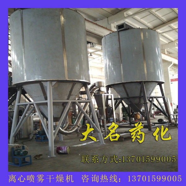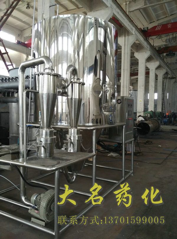 空氣經(jīng)過濾和加熱,進入干燥器頂部空氣分配器,熱空氣呈螺旋狀均勻地進入干燥室。料液經(jīng)塔體頂部的高速離心霧化器,(旋轉(zhuǎn))噴霧成極細微的霧狀液珠,與熱空氣并流接觸在極短的時間內(nèi)可干燥為成品。成品連續(xù)地由干燥塔底部和旋風分離器中輸出,廢氣由風機排空。